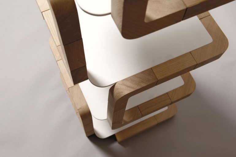 Chêne massif et pierre acrylique, vernis mat.
